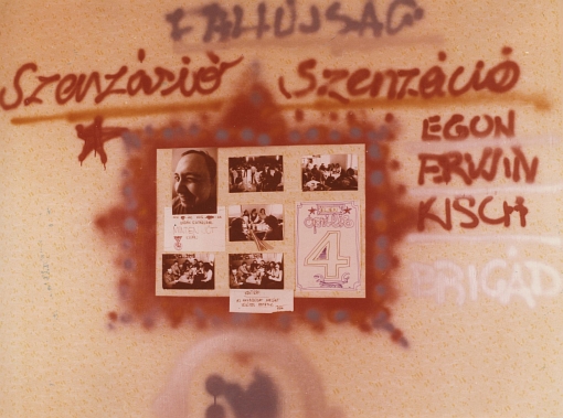 Egy esti sörözést követően Pécsi Gabi nekiesett a szerkesztőségi titkárság bejáratánál lévő nagyobb falfelületnek, s szórópalackokkal megalkotta brigádunk faliújságját!