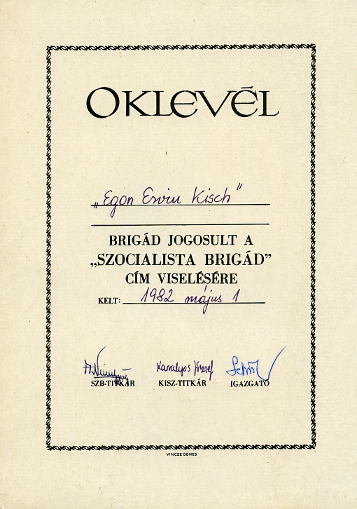 Jött a következő feladat: nevet kellett adni a gyermeknek! Országszerte, százszámra volt Leninről, magyar-szovjet barátságról, április 4-ről, május 1-ről elnevezett szocialista brigád. Nekünk sem okozott problémát nevet találni. Szerkesztőségről lévén szó, csak Egon Erwin Kisch, a száguldó riporter jöhetett szóba. Akkor már hazánkban közel százötvenezer brigád működött, de szerkesztőségben addig még egy sem alakult. És Egon Erwin Kisch névre keresztelt sem volt...